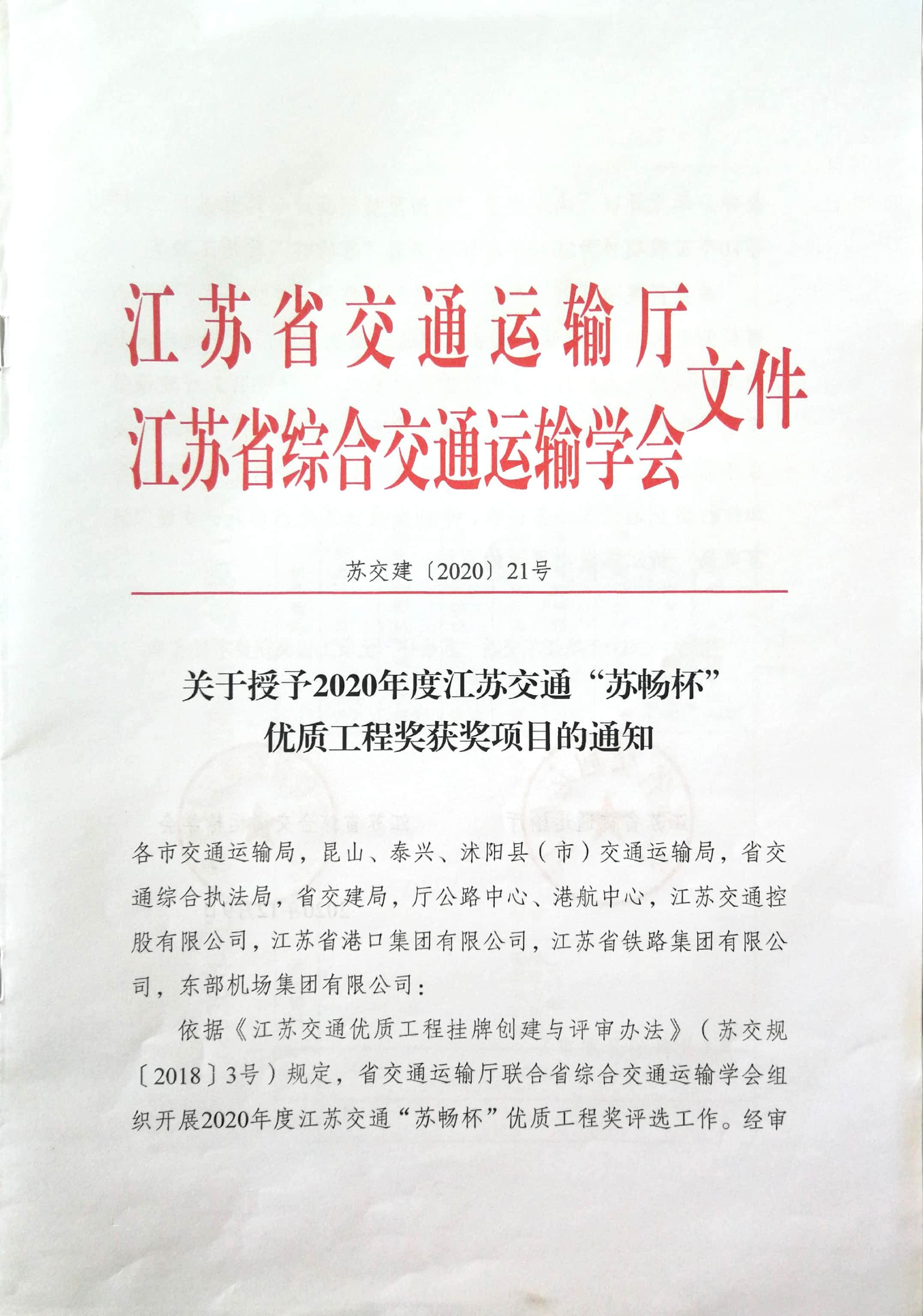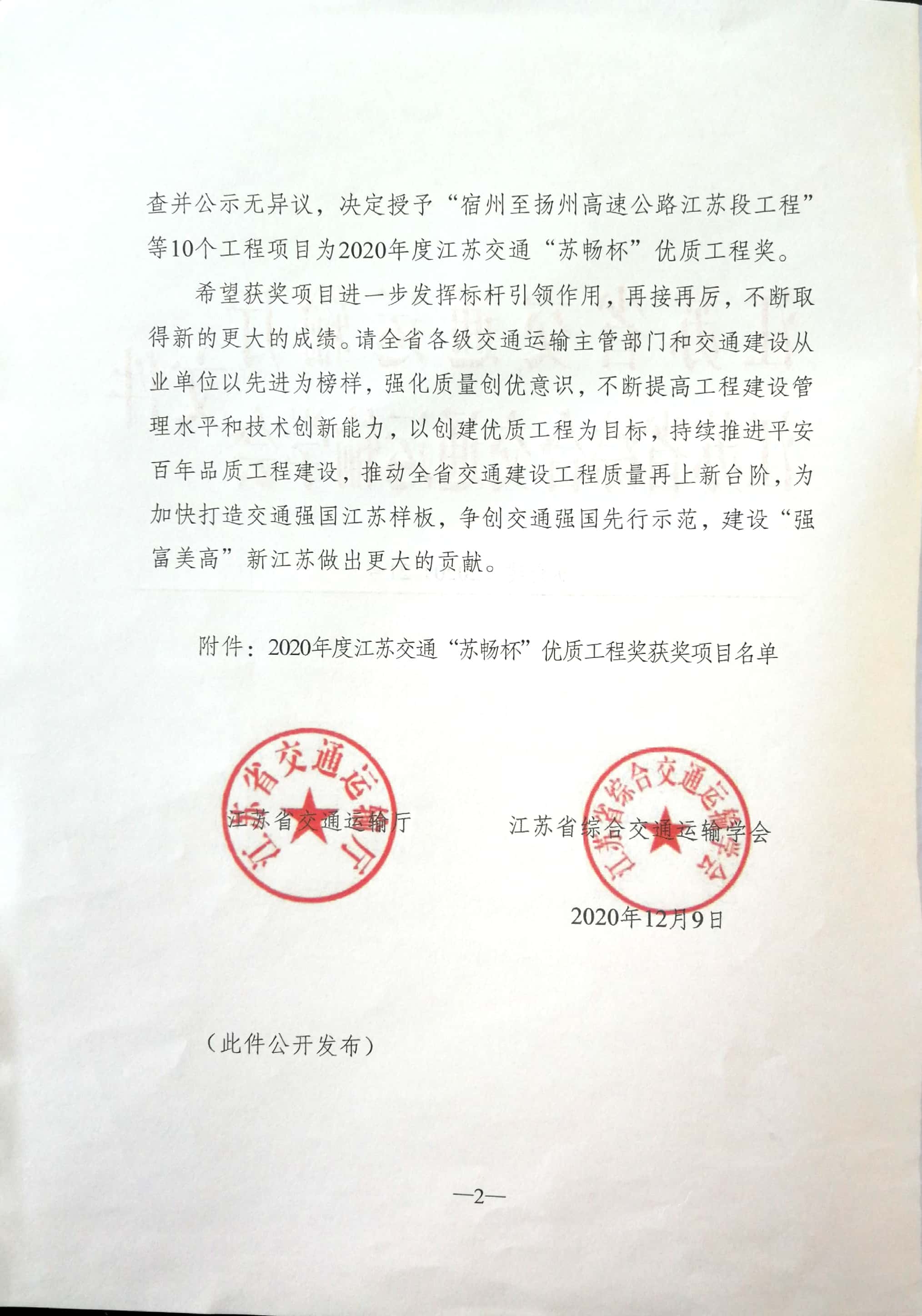 依据《江苏交通优质工程挂牌创建与评审办法》(苏交规〔2018〕3号)规定,省交通运输厅联合省综合交通运输协会组织开展2020年度江苏交通“苏畅杯”优质工程奖评选工作。我司参监的“348省道楚州车桥至洪泽县城段工程洪泽南环段工程”荣获嘉奖。