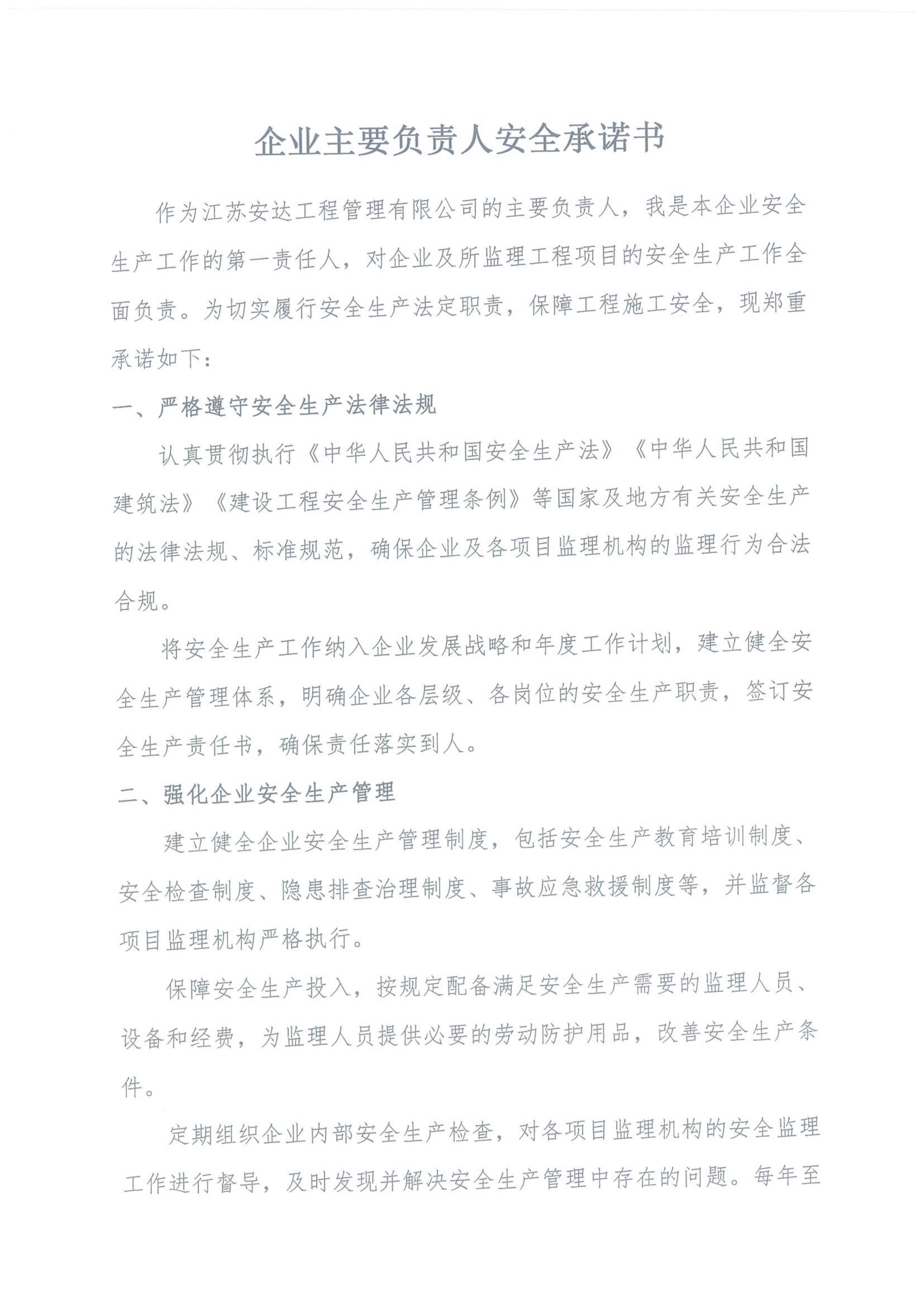 企业主要负责人安全承诺书